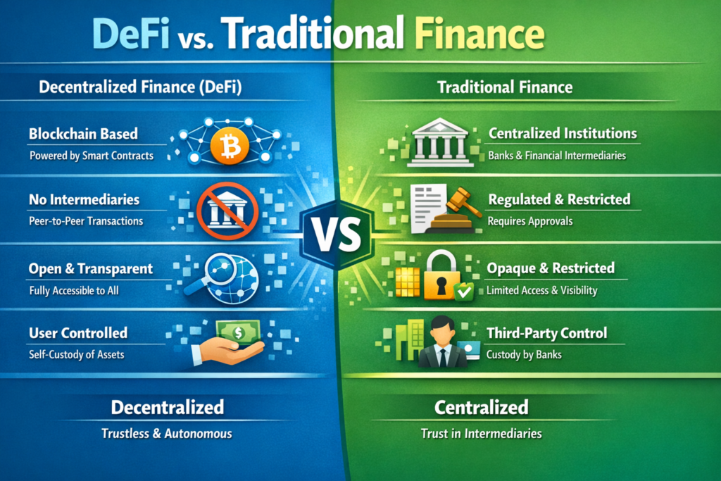 Banks act as custodians and intermediaries they hold your money, process your payments, and stand between you and financial services. DeFi replaces that intermediary layer with code. While banks offer stability, consumer protections, and regulatory oversight, DeFi offers greater accessibility and puts users in direct control. Neither is categorically better; they serve different needs and carry different trade-offs.