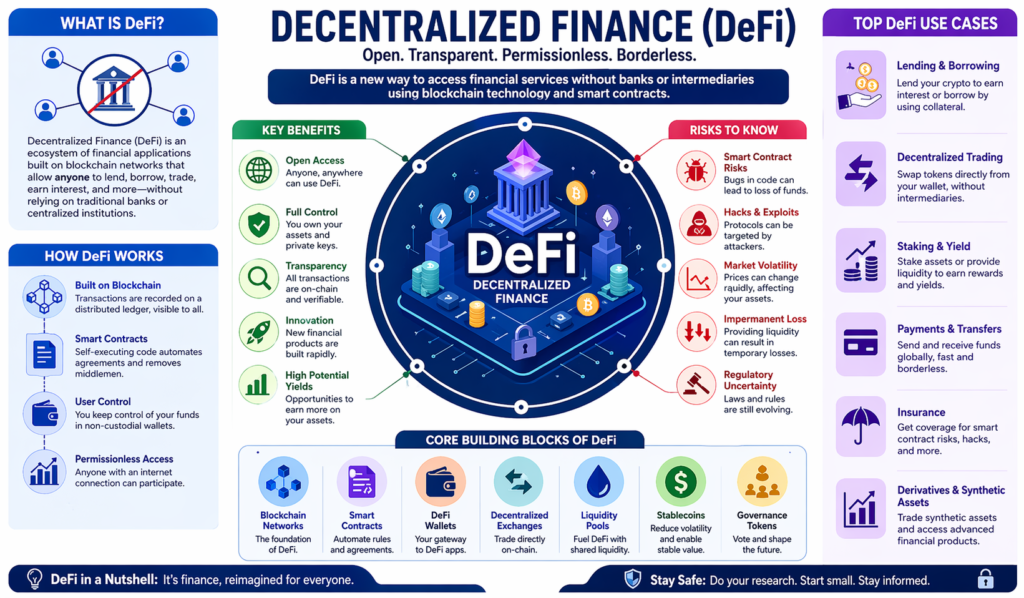 What Is Decentralized Finance (DeFi)? A Beginner’s Guide to How It Works, Benefits, Risks, and Use Cases